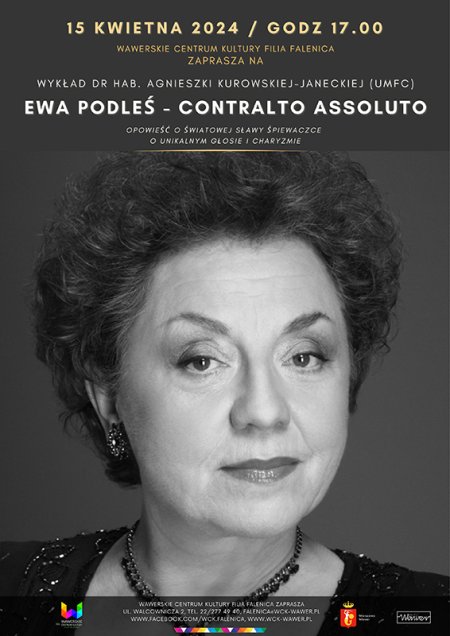 Zapraszamy na wykład dr hab. Agnieszki Kurowskiej - Janeckiej - "Ewa Poleś - Contralto Assoluto". To opowieść o światowej sławy śpiewaczce o unikalnym głosie i charyzmie.