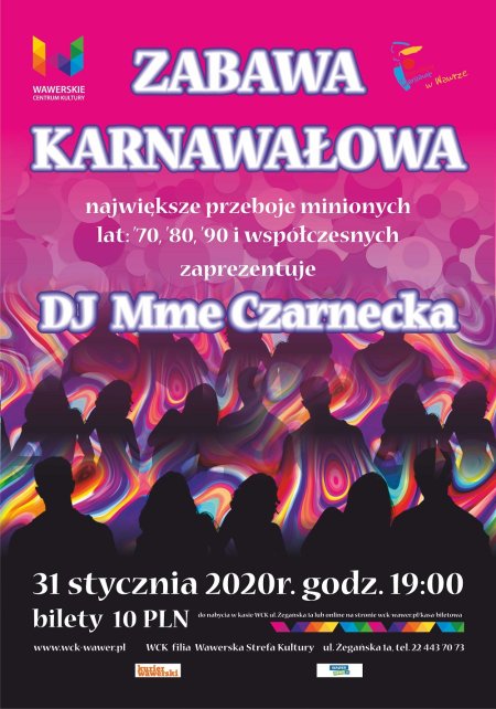 Zabawa Karnawałowa w Wawerskim Centrum Kultury dla dorosłych. Największe przeboje minionych lat '70, '80, '90 i współczesnych zaprezentuje DJ Mme Czarnecka.