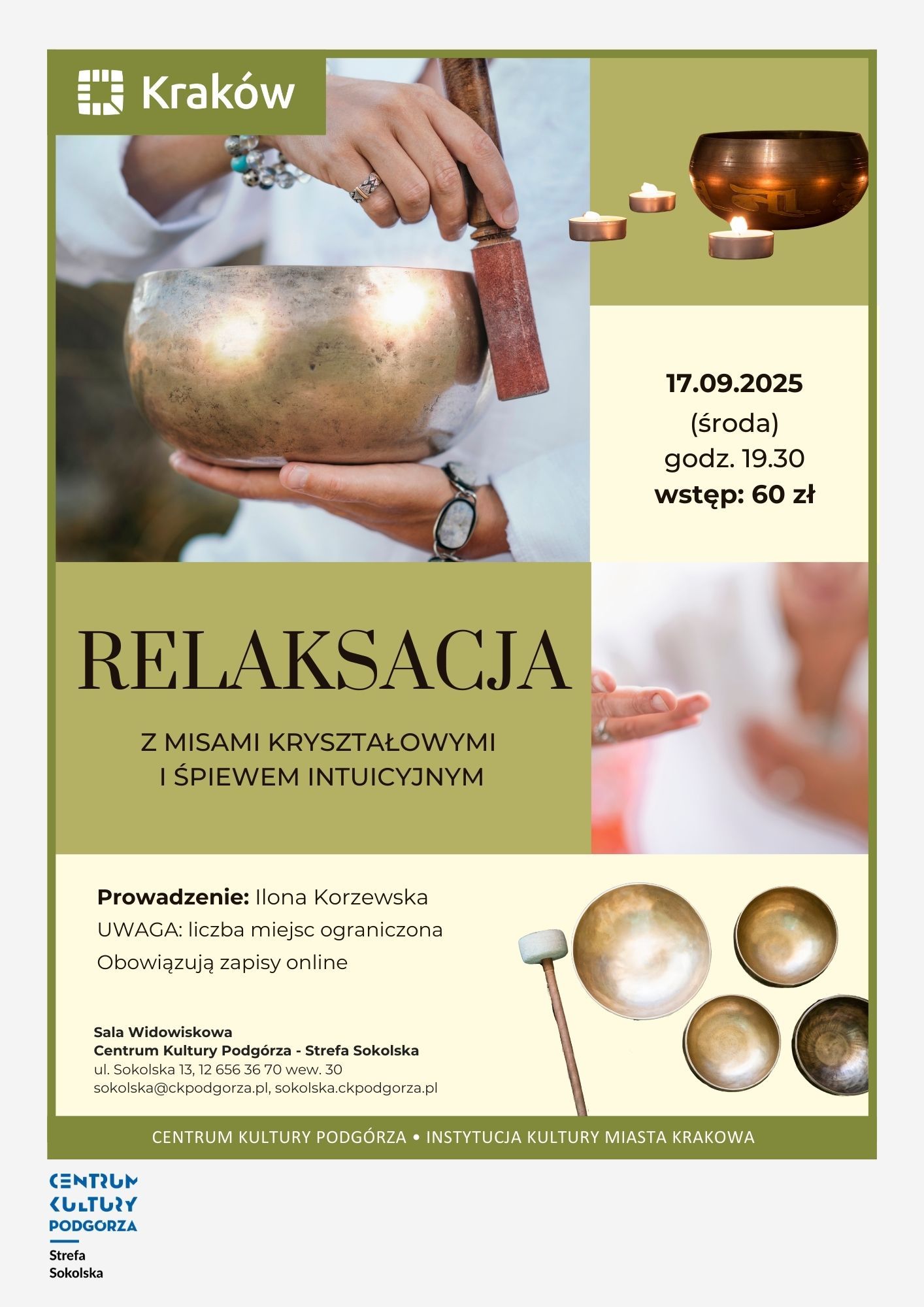Sesja relaksacyjna z misami kryształowymi to podróż w świat dźwięków, które wprowadzają ciało i umysł w stan głębokiego wyciszenia. Rozpoczyna ją dźwięk gongu wiatrowego i prowadzona medytacja, po których następuje harmonizujące brzmienie mis dostrojonych do częstotliwości 432 Hz. Dźwięki te wspomagają regenerację, redukują stres i wspierają kontakt z emocjami. Spotkanie prowadzi Ilona Korzewska – artystka i muzykoterapeutka, pracująca z instrumentami terapeutycznymi, m.in. misami, kamertonami i bębnem. Sesja kończy się chwilą ciszy i możliwością podzielenia się wrażeniami.