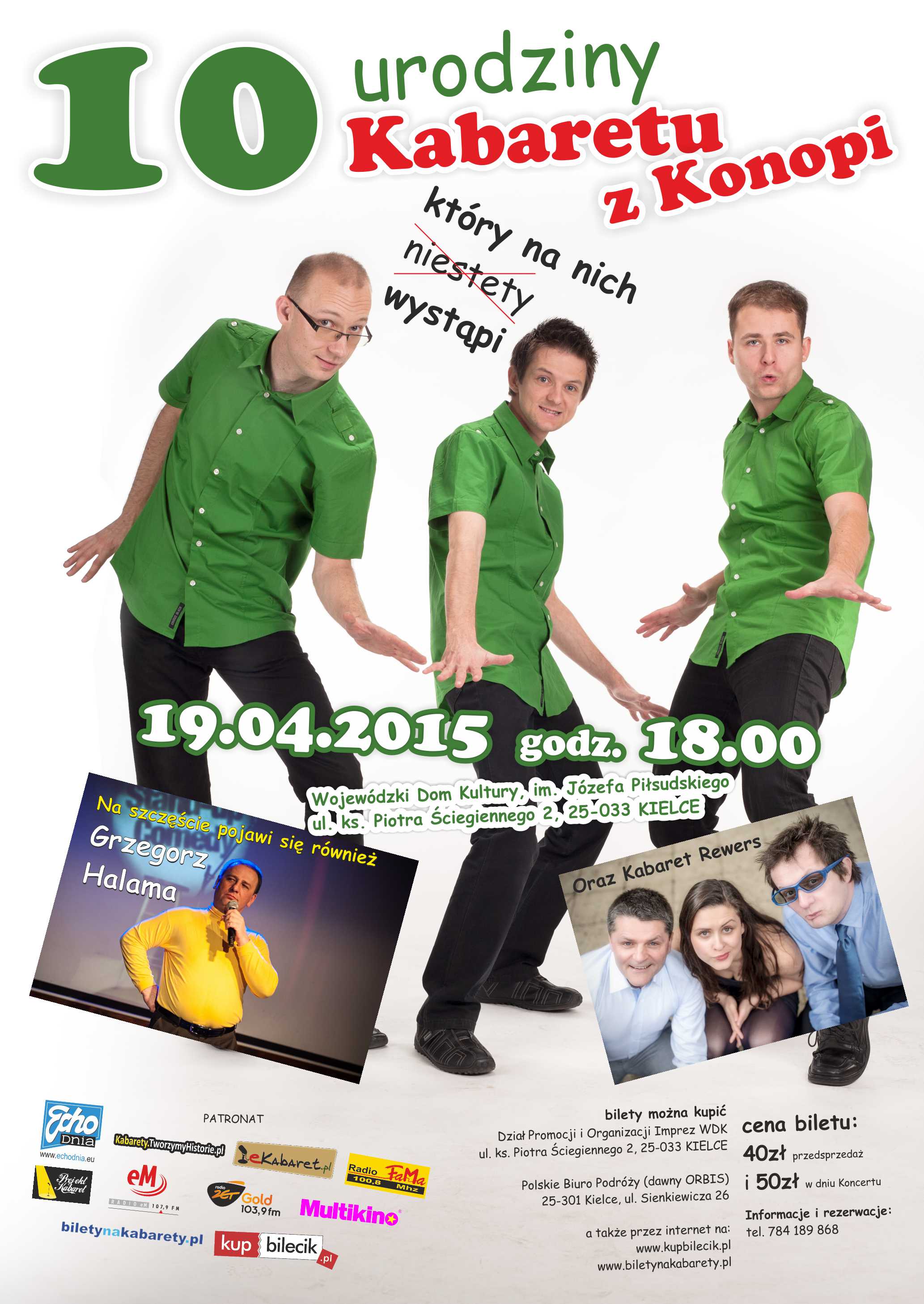 10 Urodziny Kabaretu z Konopi to impreza na której nie zabraknie najlepszych skeczy i piosenek kabaretu ale także pojawią się zupełnie nowe numery oraz niespodzianki specjalnie na tę okoliczność! Gościnnie wystąpi Kabaret Rewers i Grzegorz Halama! Szykuje się mocna dawka humoru i 3 godziny zabawy pod okiem samych profesjonalistów!