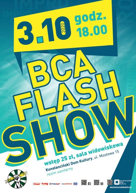 Wieczór z BCA FLASH to gwarancja spontanicznych wybuchów śmiechu, teatralnych scenek z zaskakującą puentą i dowcipnego komentarza do rzeczywistości. BCA FLASH improwizują, czyli wychodzą na scenę bez wcześniej przygotowanego scenariusza. A tam, ponosi ich wyobraźnia, wspomagana inspiracjami widzów.