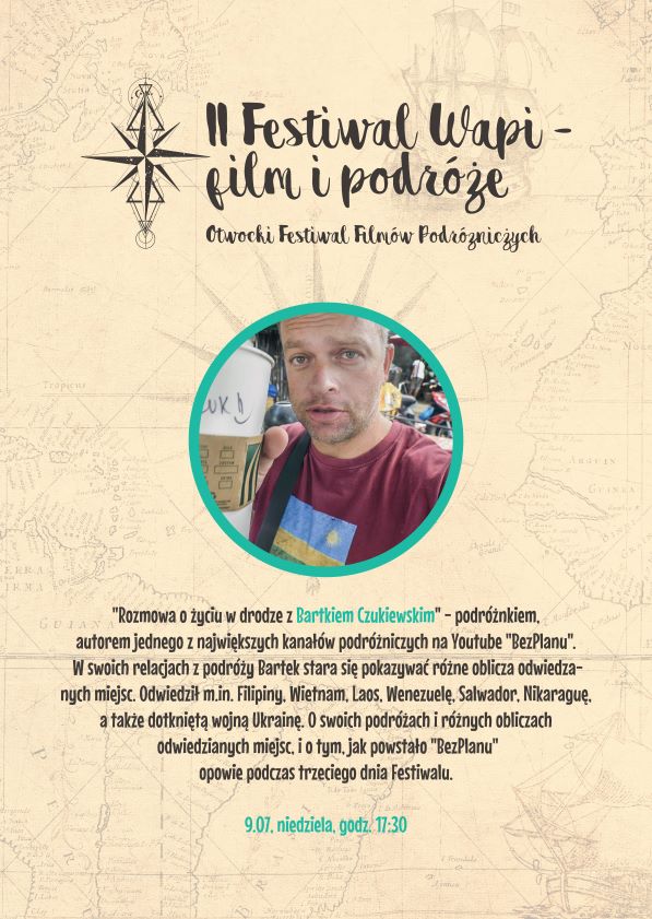 "Rozmowa o życiu w drodze z Bartkiem Czukiewskim" - podróżnkiem, autorem jednego z największych kanałów podróżniczych na Youtube "BezPlanu". W swoich relacjach z podróży Bartek stara się pokazywać różne oblicza odwiedzanych miejsc. Odwiedził m.in. Filipiny, Wietnam, Laos, Wenezuelę, Salwador, Nikaraguę, a także dotkniętą wojną Ukrainę. O swoich podróżach i różnych obliczach odwiedzianych miejsc, i o tym, jak powstało "BezPlanu" opowie podczas trzeciego dnia Festiwalu.