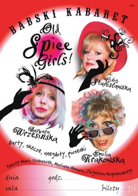 Śmiech przedłuża życie, zapewnia zdrowie i poprawia samopoczucie, stąd stały jego deficyt! Porcję szczerego śmiechu zapewni Państwu spektakl kabaretowy ”OLD SPICE GIRLS”, czyli Babski Kabaret. To kabaret z kobietami, dla kobiet i o kobietach, ale zapewne panowie również nie będą się nudzić. W rolach głównych występują: Lidia Stanisławska, Emilia Krakowska oraz Barbara Wrzesińska.