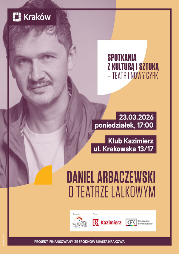 Gościem wydarzenia będzie Daniel Arbaczewski, aktor – lalkarz, reżyser teatralny, pedagog i menadżer teatru. Związany przez wiele lat z Teatrem H.Ch. Andersena w Lublinie, Teatrem Miejskim w Gliwicach, obecnie pracuje w Narodowym Starym Teatrze w Krakowie, gdzie tworzy programy edukacyjne i projekty włączające. Reżyseruje spektakle w kraju i za granicą, wykorzystując w swoich działaniach formy teatru lalkowego, jako ważne medium dialogu, integracji i narzędzie społeczne.