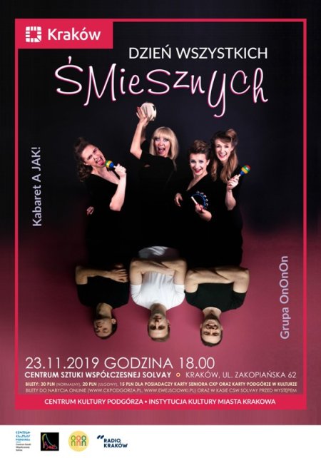 „Dzień Wszystkich Śmiesznych” to kabaretowa propozycja na listopadową chandrę. Z jesiennymi smuteczkami walczyć będą dwie młode grupy kabaretowe: A JAK! w programie „Babskie granie” oraz OnOnOn w programie „No No No”. Występ to ponad dwie godziny doskonałych żartów, zaskakujących puent oraz muzyki na żywo. Nie zabraknie również niespodzianek i kooperacji kabaretów.