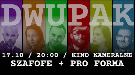 Zapraszamy na kolejny Dwupak Impro! Tym razem po raz pierwszy w gościnnych murach Kina Kameralnego. Po raz pierwszy także na scenie wystąpią razem dwie niezwykłe grupy impro: SzaFoFe i Pro Forma. Weterani scen i innych grup. Pokażą spektakl improwizowany, który zagwarantuje huragan śmiechu wszystkim, którzy zasiądą na widowni. Dlatego nie można tego przegapić, bo takie coś wydarzy się tylko raz!
