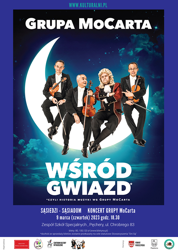 Zapraszamy na charytatywny koncert zespołu Grupa MoCarta „ Wśród Gwiazd – czyli historia muzyki wg Grupy MoCarta” w ramach projektu „Sąsiedzi – Sąsiadom”. Koncert odbędzie się 9 marca o godz. 18.30, który odbędzie się w auli Zespołu Szkół Specjalnych w Pęcherach ul. Bolesława Chrobrego 83.