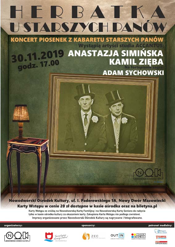 Dnia 30 listopada 2019r. o godz. 17.00 w Nowodworskim Ośrodku Kultury odbędzie się koncert piosenek z Kabaretu Starszych Panów pt. „ Herbatka u Starszych Panów”