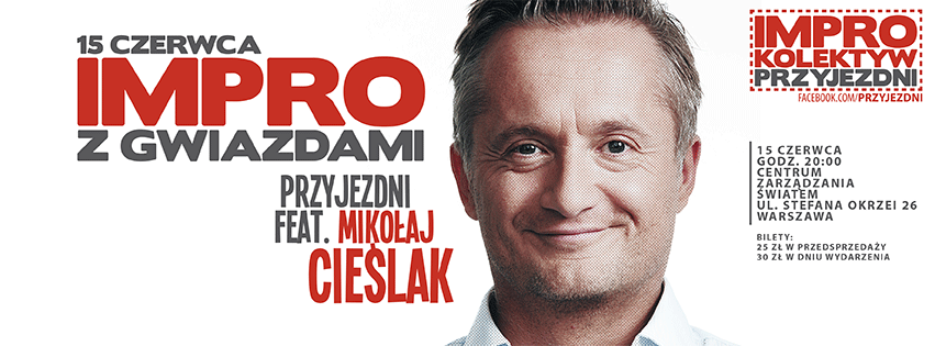 IMPRO Z GWIAZDAMI to cykl wieczorów komedii improwizowanej, na które PRZYJEZDNI zapraszają do wspólnego występu znanych i lubianych komików, aktorów, kabareciarzy, prezenterów. Tym razem we wspólnym improwizowanym show zobaczymy jedynego, niewiarygodnego, najlepszego, pełnego Moralnego Niepokoju - Mikołaja Cieślaka!