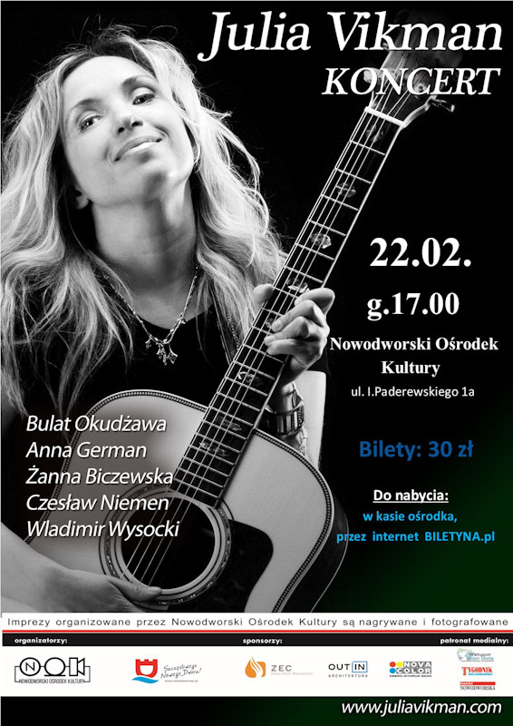 Zapraszamy na koncert Julii Vikman, w której wykonaniu usłyszymy najpiękniejsze ballady i romanse rosyjskie, ale nie tylko. W programie koncertu znajdą się także utwory z repertuaru Żanny Biczewskiej, Bułata Okudżawy, Włodzimierza Wysockiego czy Anny German.