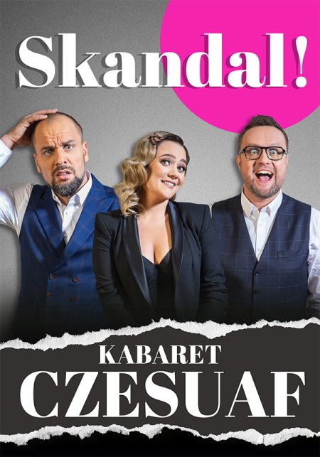 KABARET CZESUAF nie zwalnia tempa. Po doskonale przyjętym przez widzów programie "Przyjęcie" czwórka Cześków rusza w Polskę z całkowicie nowym programem zatytułowanym "Skandal!". Nowe historie, intrygujące postaci, nieoczekiwane rozwiązania, a to wszystko osadzone w naszej codziennej, nie zawsze łatwej rzeczywistości. Popatrzcie na otaczający świat oczami trzech przystojniaków z piękną i energiczną blondynką na czele. Dajcie się im wciągnąć w pełną zaangażowania podróż po skeczach i piosenkach, które każdemu gwarantują blisko dwie godziny doskonałej rozrywki na najwyższym poziomie. Pozwólcie się zaprosić do wspólnej, skandalicznie dobrej zabawy.