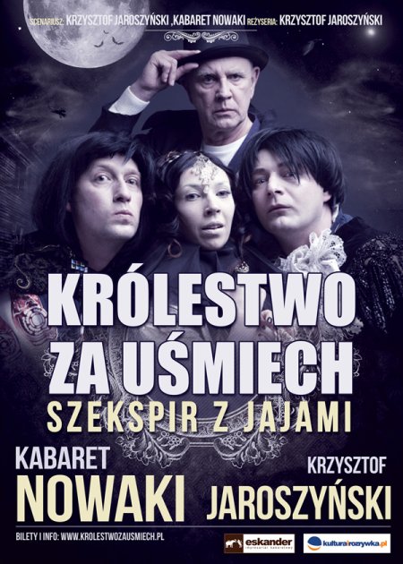 Czy można przedstawić twórczość Wiliama Szekspira wśród niemilknących śmiechów i burz oklasków? Tak! Udało się to Kabaretowi Nowaki i Krzysztofowi Jaroszyńskiemu, czyli twórcom widowiska „Królestwo za uśmiech” Bez sekundy szkolnej nudy widz dowiaduje się wiele o sztukach: Sen nocy letniej, Makbet, Wesołe Kumoszki z Windsoru, Otello, Burza, Hamlet, Król Lear. Jakim człowiekiem był Szekspir i jak powstawały jego dzieła poznacie państwo w skrzących się humorem skeczach i monologach.