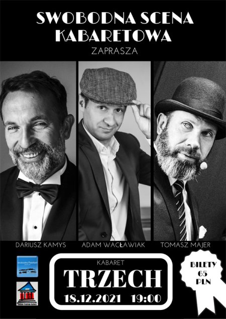 Kabaret TRZECH powstał w 3 sekundy. Wystarczyło jedno przeszywające spojrzenie DARIUSZA KAMYSA – który w kabarecie POTEM i HRABI dojrzewał 34 lata. W drugiej sekundzie spojrzenie to przeszyło TOMASZA MAJERA – który jest w kabarecie HRABI 19 lat. W sekundzie trzeciej zatrzymało się na ADAMIE WACŁAWIAKU – który stacjonował w kabaretach 7 MINUT PO i ONONON. TRZECH dojrzewało długo i tak uporczywie, że stali się nienachalnie przystojni i dziarscy. Banderas, Mick Jagger i młody Louis de Funes. Razem robią 10 pompek. Śpiewają, grają, improwizują. No i te pompki…