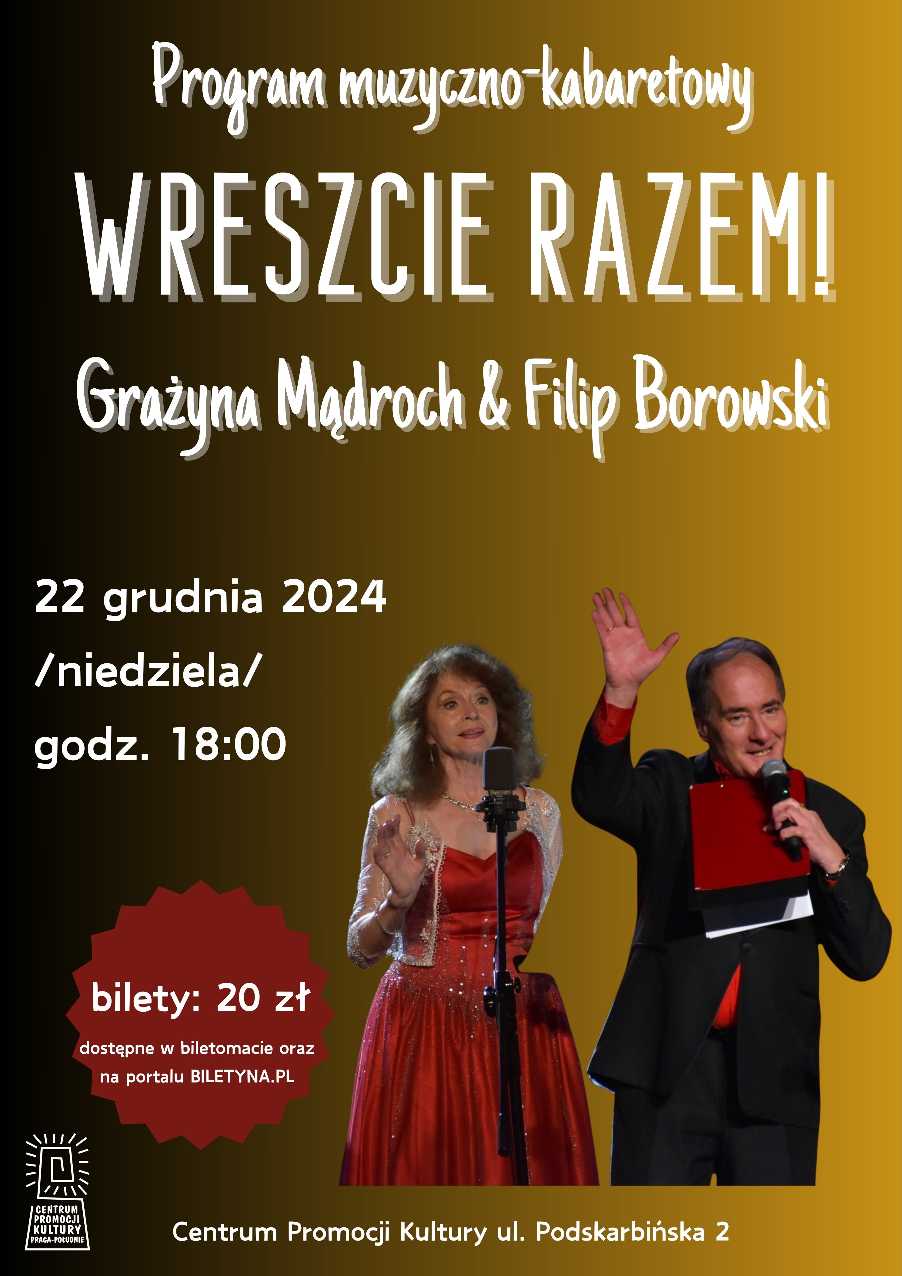 Program muzyczno-kabaretowy „WRESZCIE RAZEM” – Grażyna Mądroch & Filip Borowski. W ten szczególny przedświąteczny czas zapraszamy Państwa na specjalny program artystyczny, w którym siły połączą Grażyna Mądroch, gospodyni cyklu „Podwieczorek z muzyką kameralną” i Filip Borowski, autor programu „Kabaret Filip z Konopi”.