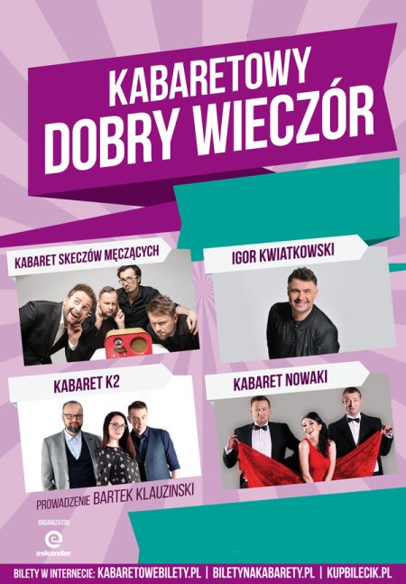 Dobry wieczór – tak wita publiczność kabaret K2 a potem zdarzenia dzieją się już błyskawicznie. Na scenie pojawiają się Kabaret Skeczów Męczących , Igor Kwiatkowski bawiąc publikę przez ponad 2 godziny. Z każdym kolejnym występem, premierowym skeczem i żartem nie masz najmniejszych wątpliwości, że to dobry wieczór.