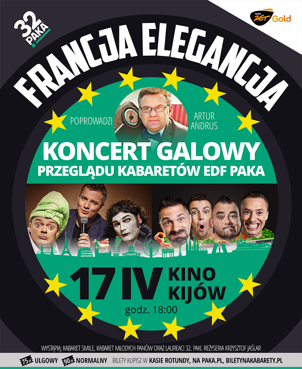 "Francja elegancja" czyli zwieńczenie 32. EDF PAKI. Paryski szyk na scenie Kijów.Centrum zaprezentują.. , świętujący niedawno dziesięciolecie działalności Kabaret Młodych Panów i bijący rekordy popularności Kabaret Smile. Obok nich laureaci tegorocznej PAKI pokażą się w zwycięskich numerach i specjalnie przygotowanych na tę okazję skeczach. Pieczę nad całością sprawować będzie Krzysztof Jaślar -reżyser od lat związany z PAKĄ, zaś cały koncert poprowadzi znany ze stylu i klasy Artur Andrus. Serce śmiejącej się Europy bije w Krakowie na PACE!
