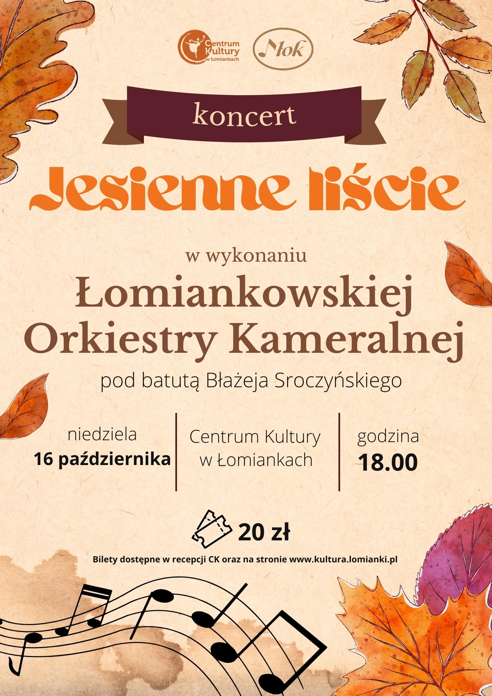 „Jesienne liście” to koncert Łomiankowskiej Orkiestry Kameralnej, który odbędzie się w niedzielny wieczór 16 października. Jak zapewnia nas dyrygent Błażej Sroczyński, podczas koncertu usłyszymy utwory, które w radosny sposób pomogą zaaklimatyzować się nam z jesienną aurą panującą za naszymi oknami. Pamiętajmy, że jesień to jedna z najpiękniejszych pór roku mieniąca się tysiącem kolorów, tak jak i repertuar przygotowany specjalnie na ten jesienny koncert. Zaprezentowane utwory będą nieść za sobą piękne ale również i nostalgiczne wspomnienia bo przecież jesień w muzyce nie jedno ma imię.