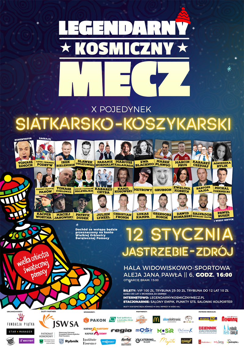 Legendarny Kosmiczny Mecz, czyli pojedynek siatkarsko-koszykarski Kabareciarzy i Przyjaciół oraz Gwiazd Sportu to w Rybniku impreza z długą, 9-letnią tradycją. Tym większą przyjemnością jest dla nas organizacja jubileuszowej, 10. edycji, w pięknej i przestronnej Hali Widowiskowo-Sportowej w Jastrzębiu-Zdroju! Imprezę - jak co roku - organizujemy na rzecz Wielkiej Orkiestry Świątecznej Pomocy! Lista gwiazd tegorocznego Kosmicznego Meczu jest wciąż otwarta!