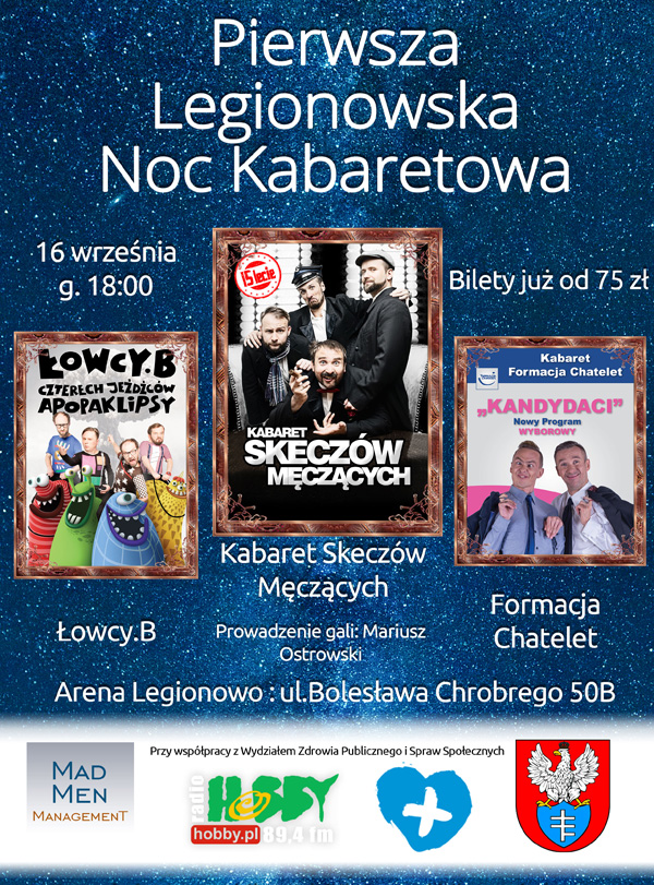 Przed nami pierwsza edycja Legionowskiej Nocy Kabaretowej. Jest to wydarzenie, które zrzeszać będzie największe gwiazdy polskiego kabaretu na jednej scenie. W tym roku wystąpią dla Państwa - Kabaret Skeczów Męczących, Łowcy.B oraz Formacja Chatelet. Gospodarzem wieczoru będzie Mariusz Ostrowski. Wydarzenie wspiera fundację Wydziału Zdrowia Miasta Legionowo działającą na rzecz osób niepełnosprawnych. Serdecznie zapraszamy!