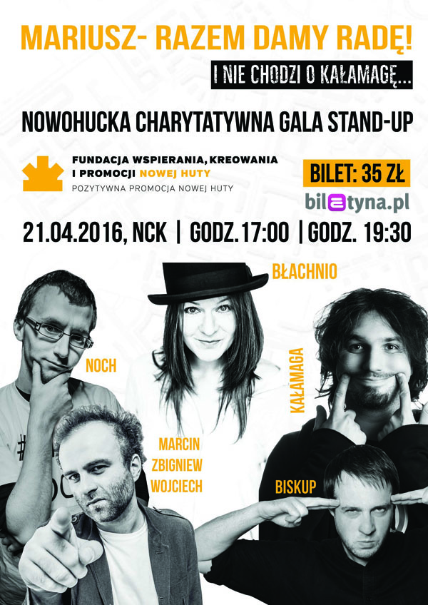 Już 21 kwietnia 2016 r. w NCK'u odbędzie się Nowohucka Gala Stand-up, z której całkowity dochód zostanie przeznaczony na potrzeby Mariusza! Swoją obecność zapowiedzieli już słynni artyści sceny kabaretowej :)