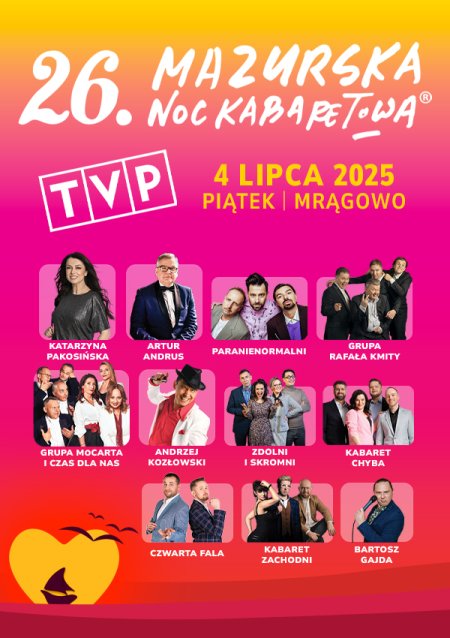 🎭 26. Mazurska Noc Kabaretowa rusza w Rejs Miłości! 4 lipca w Mrągowie: śmiech do łez, plejada kabaretowych gwiazd i muzyka na żywo. Wsiadaj na pokład i baw się na najlepszym wydarzeniu lata! 🚢😄🎶
