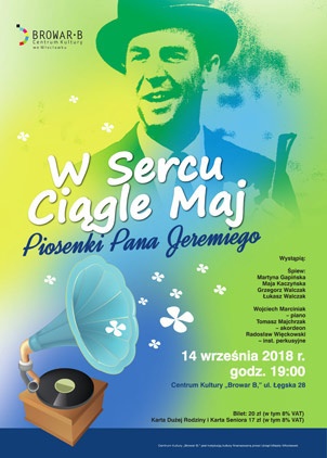 Zapraszamy na wyjątkowe przedsięwzięcie kulturalne „W sercu ciągle maj – piosenki Pana Jeremiego” 14 września o godz. 19.00 w Centrum Kultury „Browar B”. ul. Łęgska 28. Koncert „W sercu ciągle maj – piosenki Pana Jeremiego”. 60 lat temu „Kabaret Starszych Panów” odmienił estetykę polskiej piosenki. Wyrafinowane, często zabawne teksty Jeremiego Przybory do muzyki Jerzego Wasowskiego znają niemal wszyscy. Wieczne szlagiery wykonają młodzi włocławscy wokaliści i muzycy. Bilety: 20 zł do nabycia w kasie CK „Browar B.” i na biletyna.pl