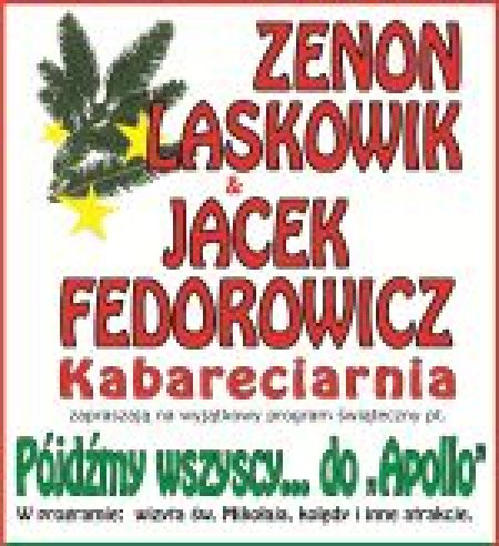 Zenon Laskowik & Jacek Fedorowicz oraz Kabareciarnia zapraszają na wyjatkowy program świąteczny pt. Pójdźmy wszyscy... do "Apollo". W programie wizyta św. Mikołaja, kolędy i inne atrakcje.