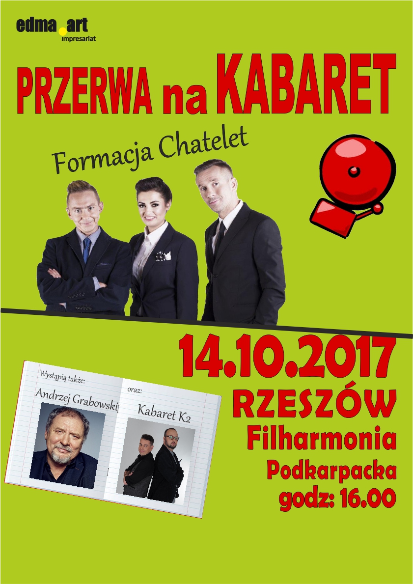 Przerwa na KABARET" to autorski program trzech podmiotów kabaretowych: FORMACJI CHATELET, KABARETU K2 oraz Andrzeja GRABOWSKIEGO. Przez ponad dwie godziny szóstka znakomitych Artystów kabaretowych będzie dosłownie "stawać na głowie", aby rozśmieszyć rzeszowską publiczność do łez. A ponieważ 14 października to Dzień Nauczyciela, mottem przewodnim całego programu będzie szeroko pojęta EDUKACJA. Tego nie zobaczycie ani w telewizji ani w internecie a jedynie na żywo w Rzeszowie! Prowadzenie: Basia Tomkowiak i Adam Małczyk.