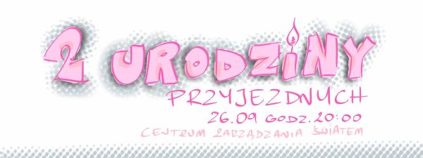 To już dwa lata! Dokładnie 26 września 2014 roku odbyła się premiera Przyjezdnych :) Swój jubileusz obchodzić będziemy w zaprzyjaźnionym Centrum Zarządzania Światem, gdzie uraczymy naszych gości zestawem szalonych gier impro w urodzinowym wydaniu. Będzie to jednocześnie dla nas rozpoczęcie nowego sezonu - jesteśmy głodni impro po wakacjach, a Wy??? Obecność obowiązkowa! Prezenty mile widziane :)