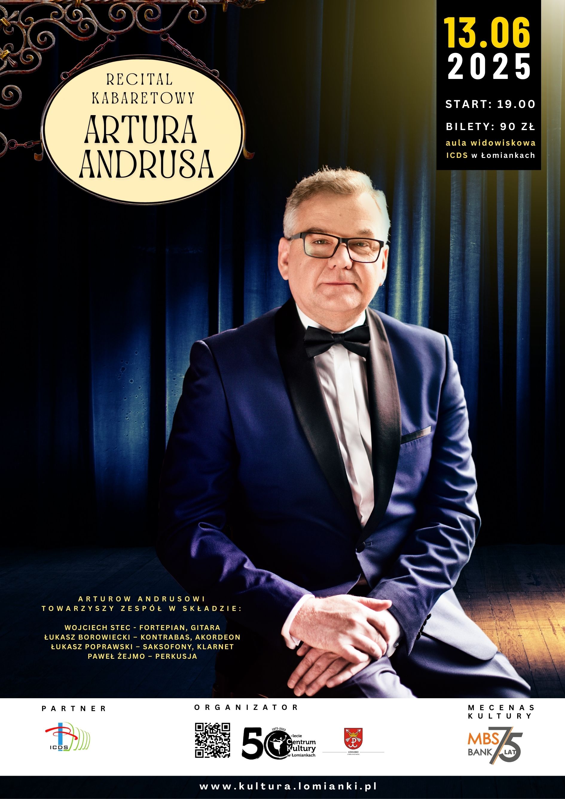 Zapraszamy na Recital Kabaretowy Artura Andrusa, w którym usłyszymy znane, lubiane, wciąż przez publiczność oczekiwane utwory, będące już niekwestionowanymi przebojami piosenki kabaretowej. Pojawią się także te pochodzące z ostatniego albumu pt.„Sokratesa 18” O podróżach - dalekich i bliskich. O miejscach. Takich, w których autor był i takich, w których go nie było, bo niektóre nawet nie istnieją. O uczuciach. Własnych i cudzych. Przeżytych, zauważonych, zasłyszanych i zmyślonych. Trochę poważnie i trochę nie. Piosenki będą przeplatane wierszami, humorystycznymi komentarzami, anegdotami, zawsze na najwyższym poziomie – o czym chyba nikogo, kto zetknął się z tym artystą nie trzeba przekonywać.