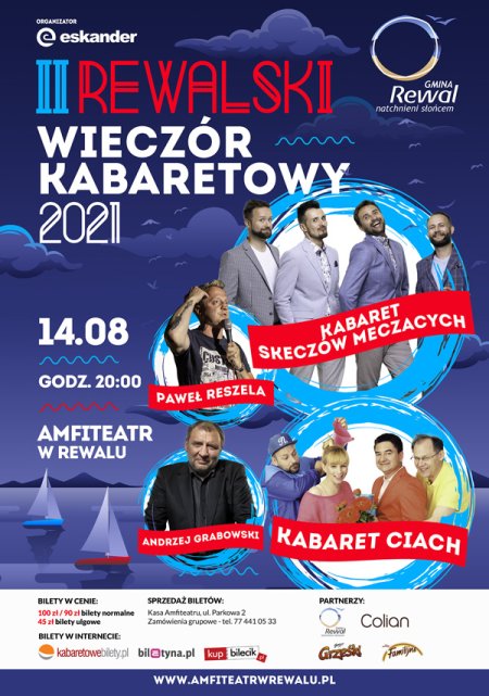 Amfiteatr w Rewalu tętni życiem nie mogłoby więc w tym miejscu zabraknąć kabaretonu z prawdziwego zdarzenia. Już 14 sierpnia o godzinie 20:00 zapraszamy na II Rewalski Wieczór Kabaretowy. Wystąpią: Kabaret Skeczów Męczących Kabaret Ciach Andrzej Grabowski Paweł Reszela Czeka więc na Was wieczór pełen śmiechu, zabawy, premierowych skeczy i humoru z najwyższej półki.