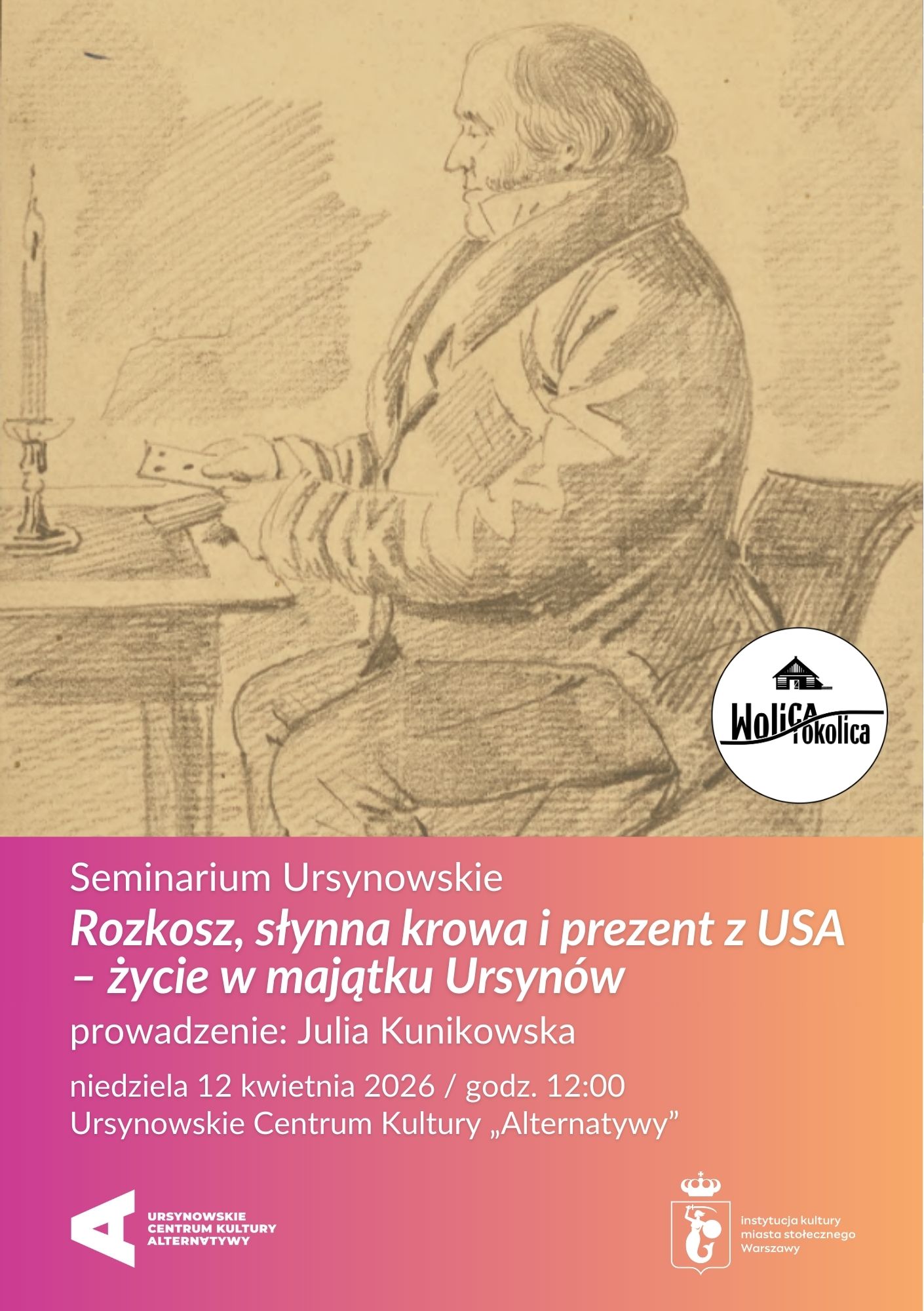 „– Gdzie mieszkasz? – W Waszyngtonie, na południu Warszawy”. Tak moglibyśmy mówić, gdyby szalony pomysł Juliana Ursyna Niemcewicza został wcielony w życie. Dziś Ursynów to nazwa całej dzielnicy, ale jeszcze 200 lat temu odnosiła się do pałacyku i majątku. To właśnie tam, na krawędzi malowniczej skarpy, tętniło życie towarzyskie i artystyczne XIX wieku, z dala od zgiełku miasta, w otoczeniu sielskich krajobrazów, sadów i dzikiej przyrody. Kto jeszcze tam mieszkał, prócz Juliana Ursyna? Dlaczego pewna krowa została upamiętniona przez poetę? I co jadał w Ursynowie Juliusz Słowacki? Dowiecie się w trakcie 11. Seminarium Ursynowskiego.