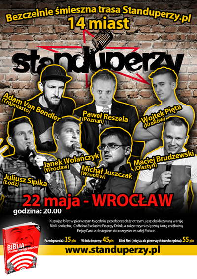 Bezczelnie śmieszna trasa Standuperzy.pl. Wrocław - Adam Van Bendler, Paweł Reszela, Wojtek Pięta, Juliusz Sipika, Maciej Brudzewski, Michał Juszczak, Janek Wolańczyk. Wystąpią: