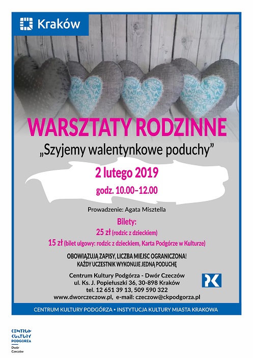 Walentynki coraz bliżej! ♥ Uszyj poduchę dla bliskiej Ci osoby! Zapraszamy serdecznie na warsztaty rodzinne, na których będziemy szyć walentynkowe poduchy! Warsztaty odbędą się 2 lutego (sobota) o godzinie 10:00 w CKP Dwór Czeczów :)