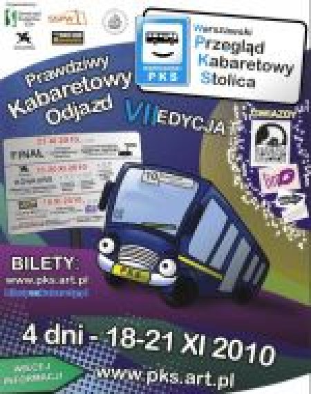 Już po raz 7-ty rusza Warszawski PKS - największy przegląd kabaretowy w polskiej stolicy! W ciągu czterech listopadowych dni na scenie wystąpi 10 kabaretów konkursowych i gwiazdy - nasi "kiedyś-zwycięzcy": warszawskie kabarety Macież i Fraszka, a także kabarety Limo i Kabaret Moralnego Niepokoju!!! Wszystko to gwarantuje 4 dni pełne śmiechu