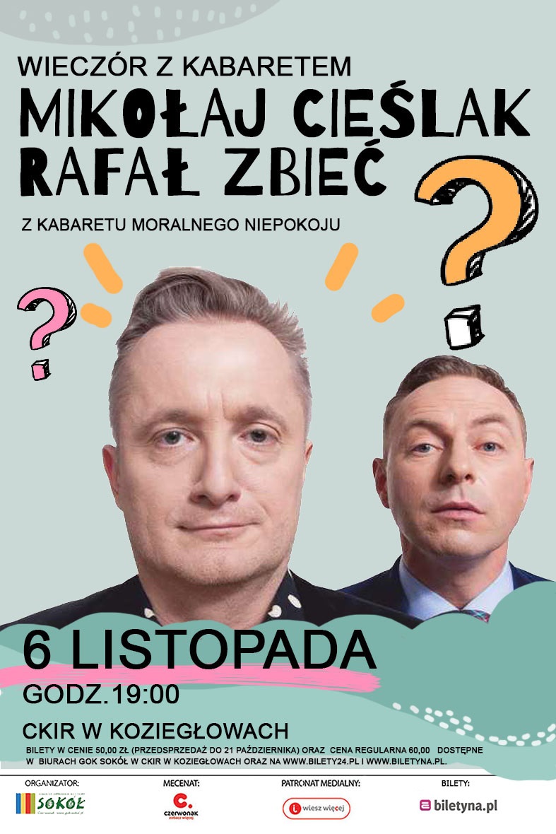 Gminny Ośrodek Kultury Sokół zaprasza 6 listopada na godzinę 19.00 do Centrum Kultury i Rekreacji w Koziegłowach na wieczór z kabaretem Mikołaj Cieślak i Rafał Zbieć z Kabaretu Moralnego Niepokoju. Wystąpią oni z wyborem skeczów, stworzonych dla Kabaretu Moralnego Niepokoju i zaadaptowanych specjalnie dla tego żywiołowego duetu przez Roberta Górskiego. W trakcie występu obaj artyści wykazują się kunsztem aktorskim i zaangażowaniem, a nieodstępujące ich poczucie humoru jest źródłem improwizacji, w której obaj świetnie się odnajdują.