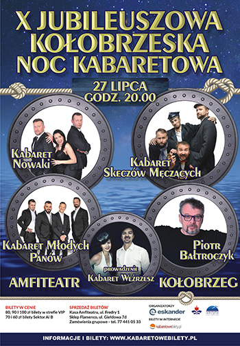 Już po raz dziesiąty zapraszamy do kołobrzeskiego amfiteatru na wspaniałą zabawę. Kogo?-Wszystkich! I tych, którzy śmieją się przez cały urlop i chcą robić to także w gronie czołówki polskich kabaretów. I tych, którzy potrzebują urlopowego rozweselenia przez mistrzów w swojej dziedzinie. I bladych i opalonych. Niezależnie od pogody i temperatury wody w Bałtyku. Śmiech to zdrowie, więc nie może go zabraknąć w najbardziej popularnym nadmorskim uzdrowisku. O Wasze zdrowie i dobrą zabawę w ten wyjątkowy jubileuszowy wieczór zadbają: Kabaret Skeczów Męczących, Kabaret Nowaki, Kabaret Młodych Panów, Piotr Bałtroczyk oraz Kabaret Weźrzesz! Tak mocnego składu w Kołobrzegu jeszcze nie było, więc nie przegap jubileuszowej Kołobrzeskiej Nocy Kabaretowej.