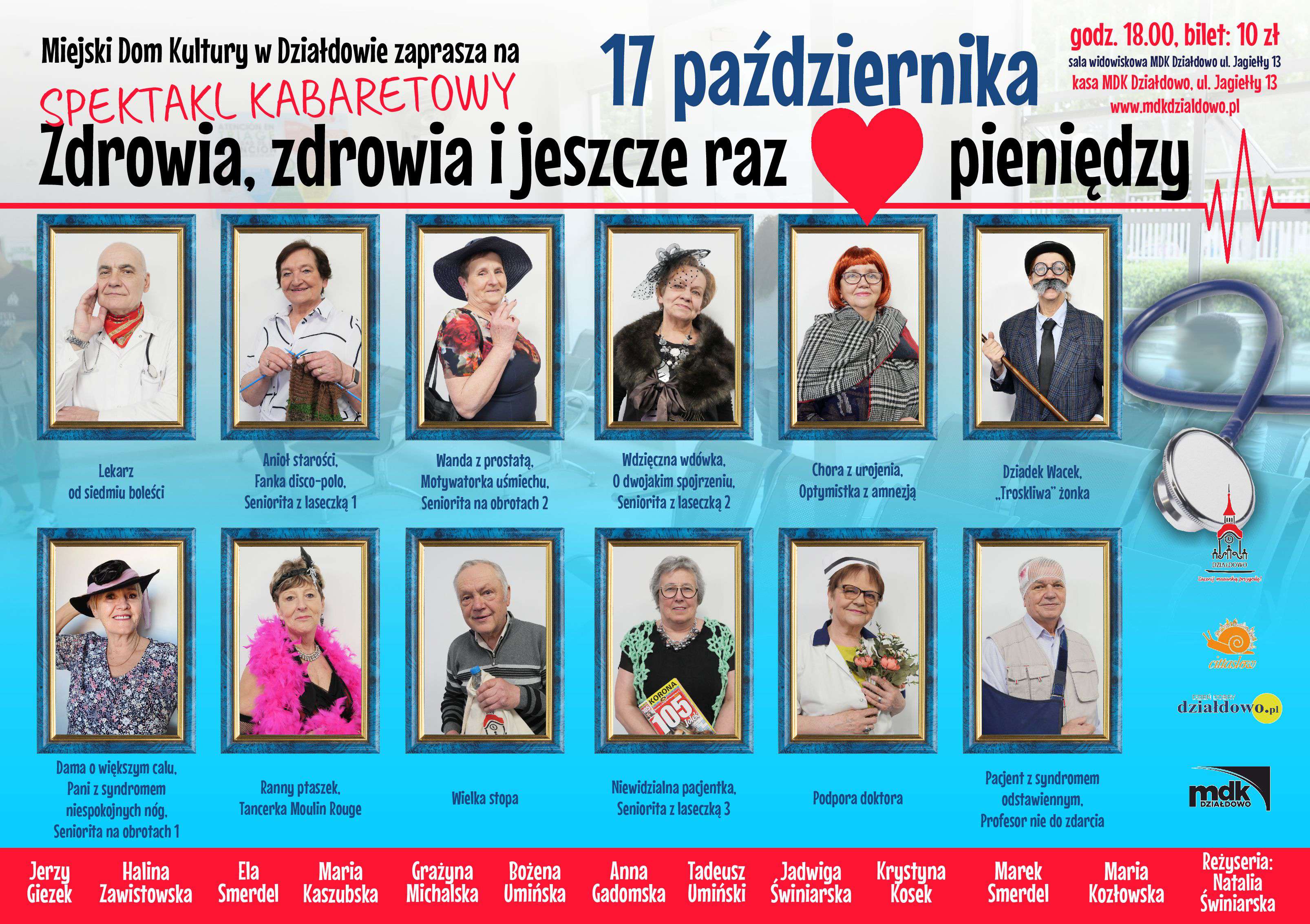 Grupa teatralna „Tymczasowo zakręceni”, działająca przy Miejskim Domu Kultury w Działdowie oraz przy Uniwersytecie Trzeciego Wieku w Działdowie, zaprasza na spektakl kabaretowy „Zdrowia, zdrowia i jeszcze raz pieniędzy”.