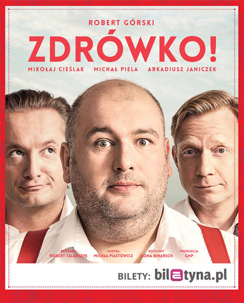 Spektakl Zdrówko! to kolejna odsłona komediowego talentu Roberta Górskiego. Twórca tekstów Kabaretu Moralnego Niepokoju chwycił tym razem za pióro, by opisać historię trzech mężczyzn, których połączył wyjazd do sanatorium w Kotlinowie Zdroju. Zdarzenia, które ich spotkają, pozwolą im dowiedzieć się więcej o sobie, ludziach i świecie na przyśpieszonym kursie życia, a widzom - śmiać się z błyskotliwych dialogów i nieco absurdalnej rzeczywistości. Historia Romana, Witka i Stefana, mężczyzn "przed przejściami", którzy chcą się poleczyć, zabawić i pożyć, to ciepła refleksja o życiu i naszych, polskich, dobrych cechach i przywarach.