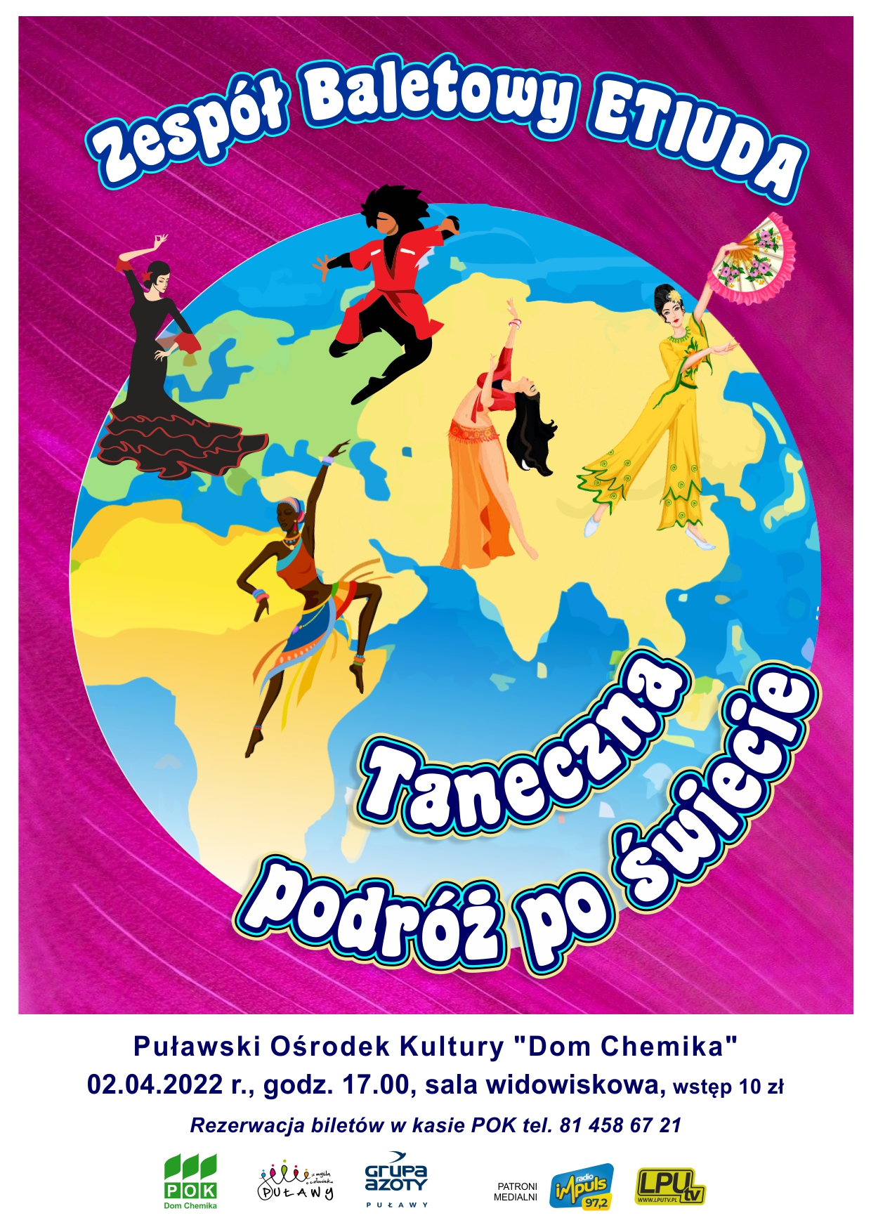 Zespół Baletowy „Etiuda” zaprasza w roztańczoną podróż dookoła świata! Podczas tej wycieczki zwiedzimy różne kraje i kontynenty, odkryjemy najsłynniejsze tańce, muzykę i kulturę różnych zakątków świata.