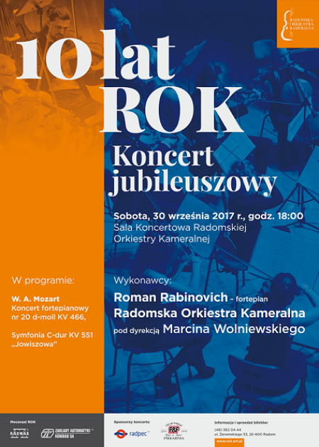 2017 rok to okrągły jubileusz 10 lat istnienia Orkiestry na muzycznym rynku Radomia, ale także całego kraju. Przez te lata Radomska Orkiestra zagrała lub zorganizowała prawie 200 koncertów w Radomiu oraz w różnych miastach Polski, na swoim koncie ma także ok. 300 audycji umuzykalniających dla dzieci i młodzieży. Każdy koncert orkiestry spotyka się z ogromnym uznaniem publiczności, bo to grupa artystów łączących entuzjazm młodości z doświadczeniem i profesjonalizmem. Wysokie umiejętności każdego członka zespołu, współpraca ze znakomitymi solistami, perfekcyjne wykonanie - to największe atuty orkiestry, która tworzy niepowtarzalne, pełne emocji, profesjonalizmu i popisu kunsztu muzycznego wydarzenia artystyczne. Taki także będzie koncert jubileuszowy. Wraz z orkiestrą zagra doskonały pianista młodego pokolenia - Roman Rabinovich. Artysta to absolwent słynnej nowojorskiej Juilliard School i Curtis Institute of Music w Filadelfii. Zwycięzca konkursu pianistycznego im. Artura Rubinsteina w Tel Awiwie w 2008 roku, regularnie zapraszany na koncerty do nowojorskiej Carnegie Hall. Muzycy zagrają pod batutą Marcina Wolniewskiego. Specjalnie dla miłośników Orkiestry w programie znalazły się przepełnione wdziękiem i wirtuozerią dzieła Mozarta: 20. Koncert fortepianowy d-moll oraz Symfonia jowiszowa.