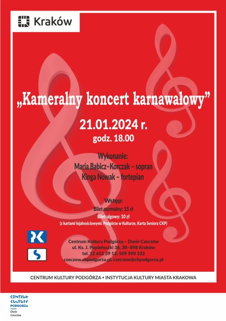 Zapraszamy na kameralny koncert karnawałowy, który odbędzie się w niedzielę 21 stycznia 2024 r. o godz. 18.00 w Dworze Czeczów.