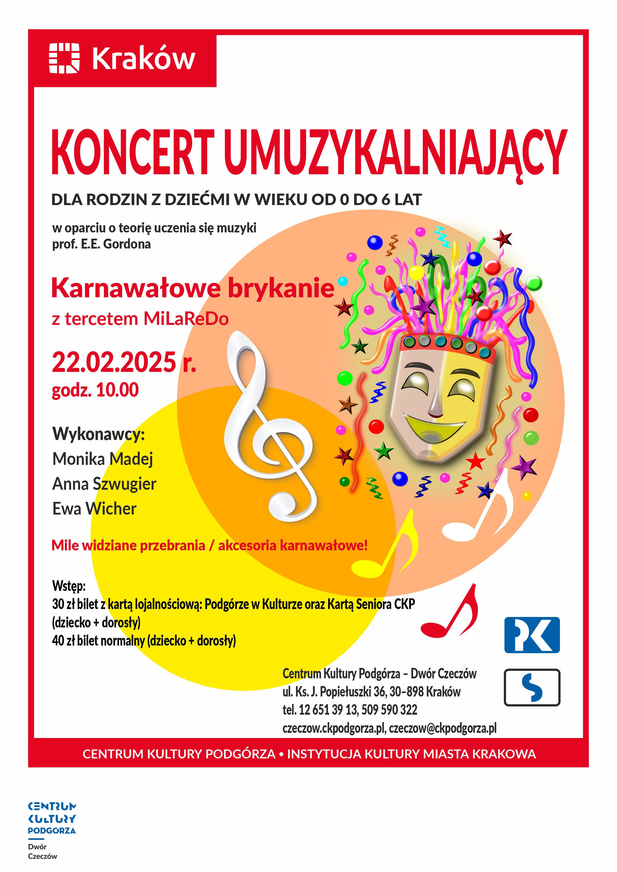 Koncert umuzykalniający dla rodzin z dziećmi w wieku 0-6 lat. Mile widziane przebrania / akcesoria karnawałowe. Buty na zmianę /skarpety antypoślizgowe oraz dobry humor OBOWIĄZKOWE. Roztańczeniem ciał / nóżek i rączek zajmiemy się MY - Wasz uwielbiany tercet MiLaReDo.