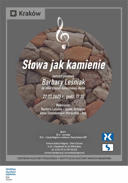 Zapraszamy na koncert piosenek Barbary Leśniak do słów Urszuli Kalecińskiej-Kucik "Słowa jak kamienie", który odbędzie się w sobotę 22 marca 2025 r. o godzinie 17.30 w Dworze Czeczów.