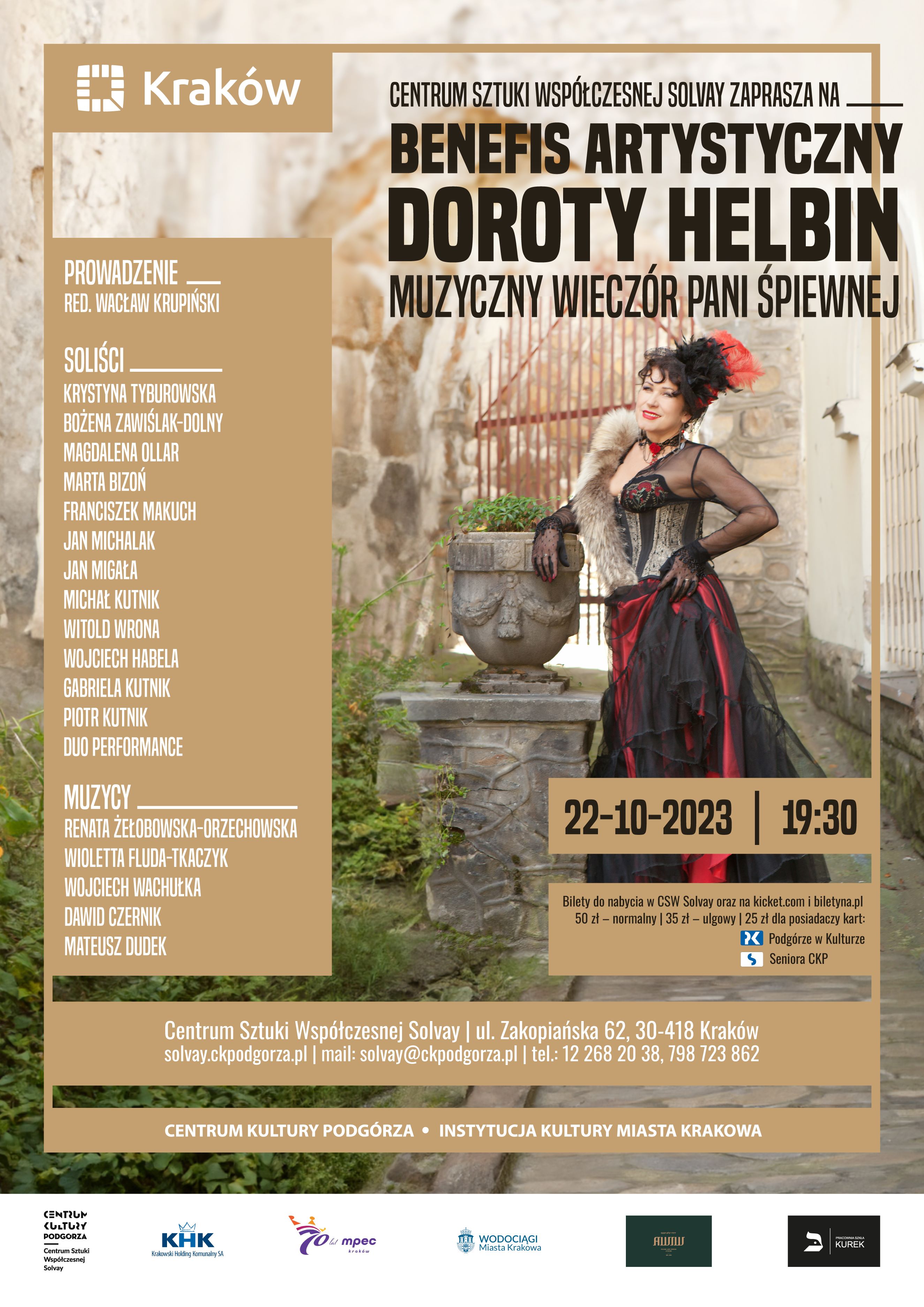 Artystka budując niezwykły klimat każdego z koncertów zaprasza na wyjątkowe obchody 35-lecia pracy scenicznej. Tego wieczoru na scenie CSW Solvay wystąpią wraz z Jubilatką soliści Opery i Operetki krakowskiej, polscy wokaliści musicalowi, gwiazdy estrady polskiej, śpiewający aktorzy teatralni i filmowi oraz najwspanialsi akompaniatorzy i wirtuozi instrumentalni.