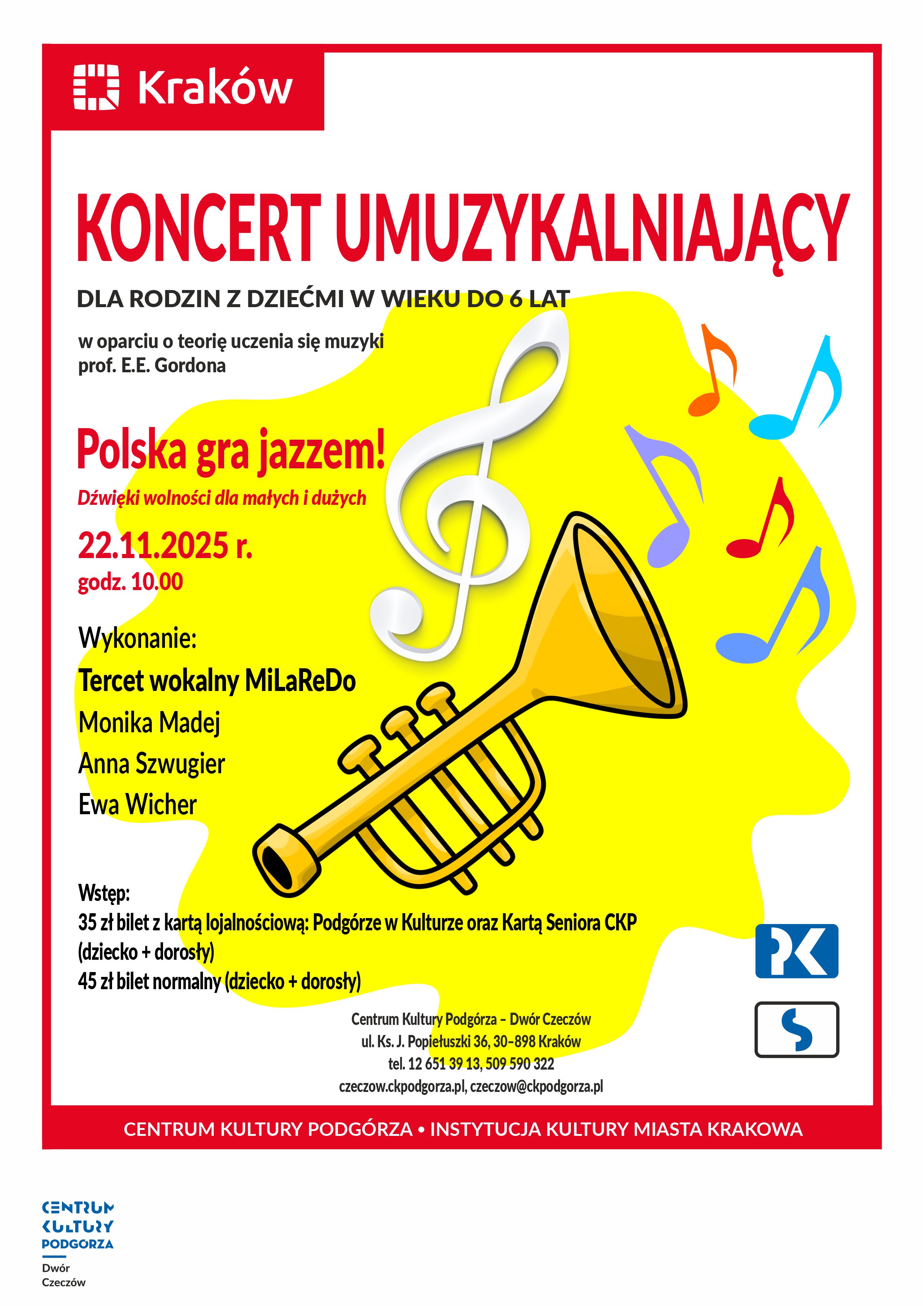 Zapraszamy na koncert Gordonowski "Polska gra jazzem! Dźwięki wolności dla małych i dużych" tercetu MiLaReDo, który odbędzie się w sobotę 22 listopada 2025 roku o godzinie 10.00 w Dworze Czeczów.