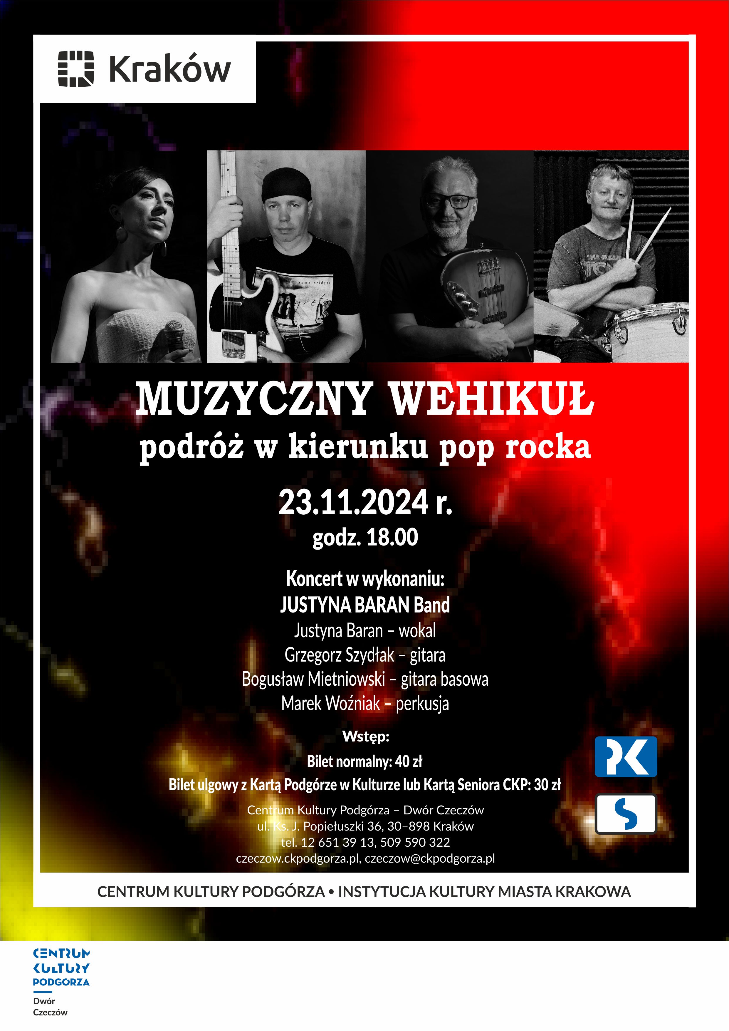 23.11.2024 - "MUZYCZNY WEHIKUŁ - podróż po największych przebojach pop rock", Justyna Baran Band, Dwór Czeczów