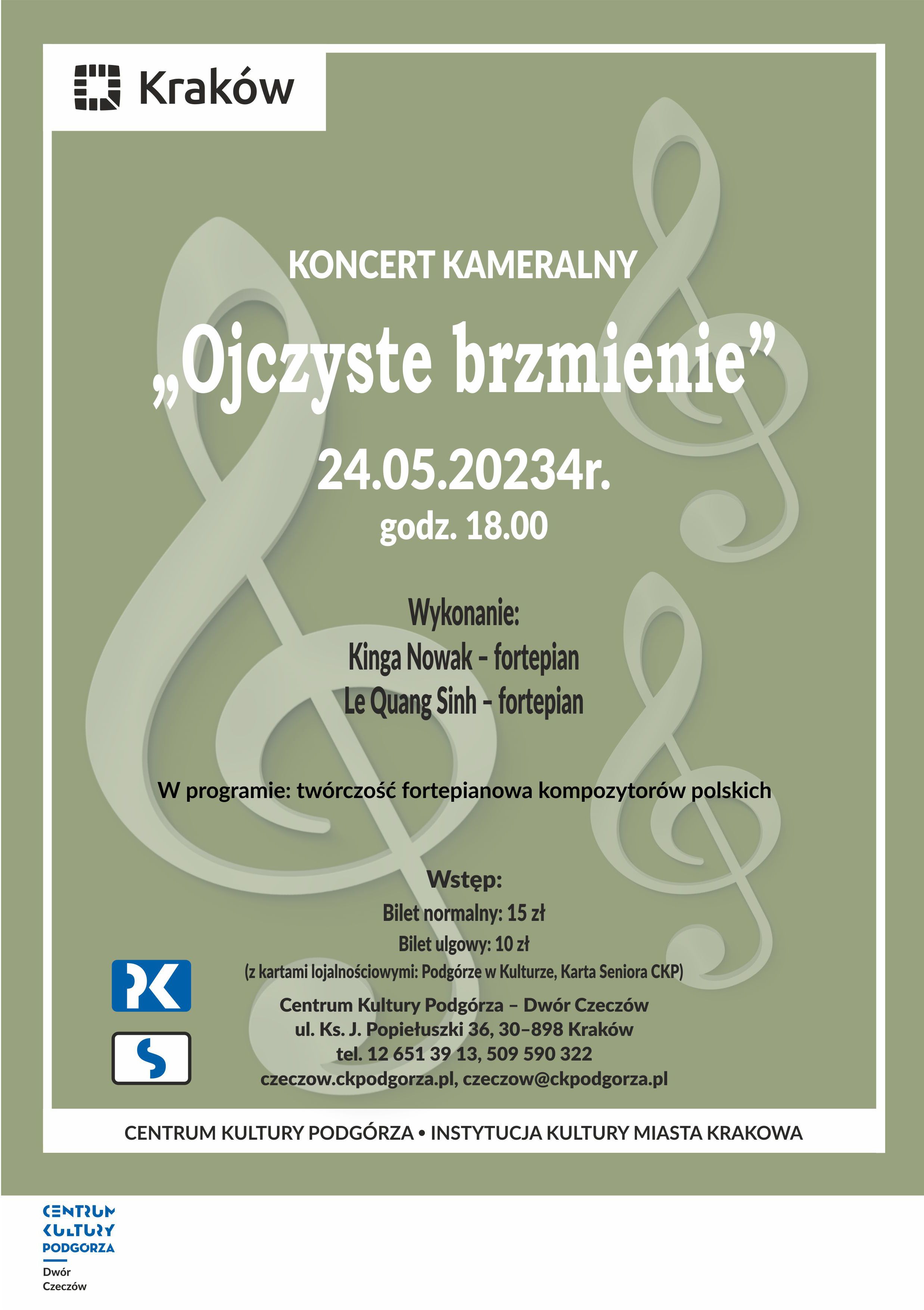Zapraszamy na koncert kameralny "Ojczyste brzmienie", który odbędzie się w piątek 24 maja 2024 o godz. 18.00 w Dworze Czeczów.