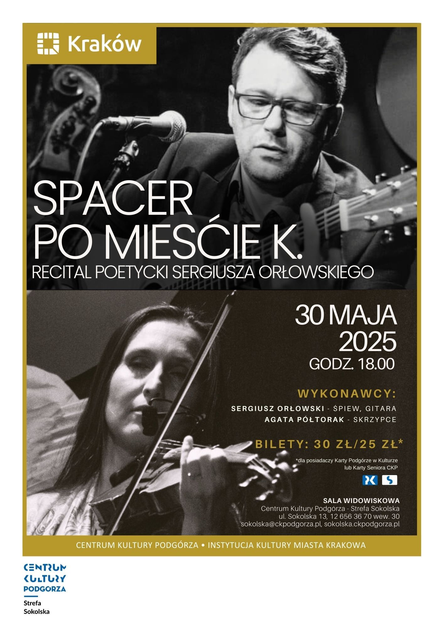 30.05 Koncert „Spacer po mieście K.” – recital poetycki Sergiusza Orłowskiego Wykonawcy: Sergiusz Orłowski – śpiew, gitara Agata Półtorak – skrzypce