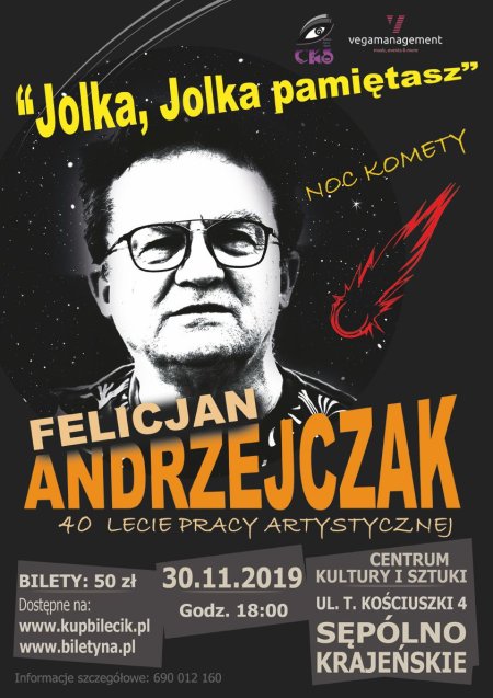 Zapraszamy na koncert legendarnego polskiego wokalisty, Felicjana Andrzejczaka. Wszyscy doskonale znamy takie przeboje, jak „Jolka, Jolka Pamiętasz” czy „Noc Komety”, to właśnie charakterystyczny głos Felicjana Andrzejczaka zapewnił im nieśmiertelność. Te i inne piosenki z bogatego repertuaru Artysty będą mieli Państwo okazję usłyszeć na żywo już 30 listopada o godzinie 18:00 w Centrum Kultury i Sztuki w Sępólnie Krajeńskim. Nie zabraknie wspomnianych evergreenów nagranych wraz z Budką Suflera, a także solowych utworów świętującego w tym roku 40-lecie pracy artystycznej wokalisty.